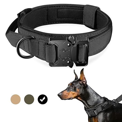- 【Metal Buckle and Fastening Tape】quick release metal buckle dog collar is easy to put on/off and makes it hard to break and prevents your pet dogs, military dogs from tearing and chewing it up.With fastening tape , you can adjust the size of dog collar. Adjustable collars for dogs has soft padding from inside to provide a comfortable feel to your dog.Dog Collar for Large dogs with strong pulling could bear 397-661lb(180-300kg) pulling force.